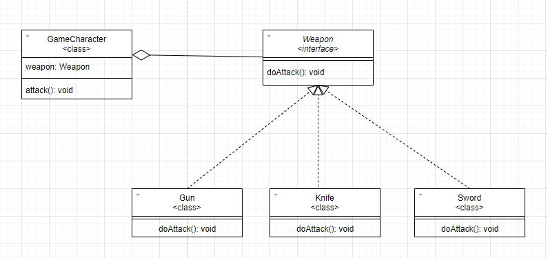 예를들어 게임캐릭터와 무기를 구현한다고 했을때 전략패턴을 사용해 보겠습니다